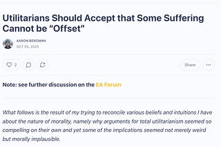 This is an audio readout of my recent post Utilitarians Should Accept that Some Suffering Cannot be “Offset”, also on the EA Forum