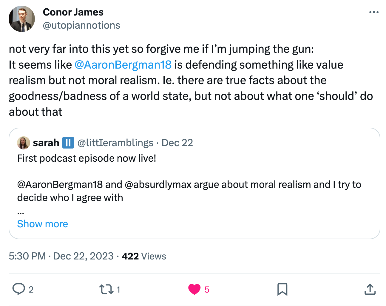 In spite of the name of the episode and the best of my knowledge/understanding a few days ago, it turns out my stance may not be ~genuine~ moral realism.