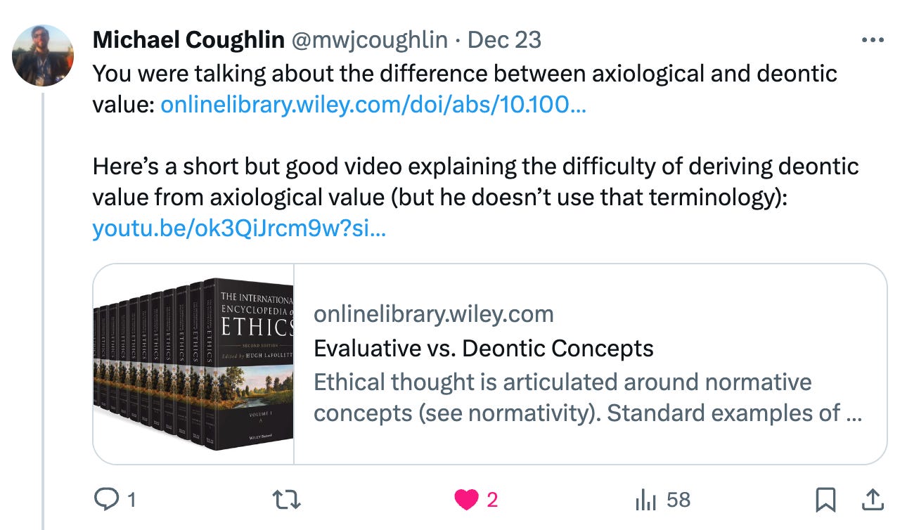 Aaron: Although I think the person ended up agreeing with me. One thing is, I think some people just have the sense those two statements are basically just saying are just like, rewording of the same thing. And that's just not my sense. But maybe I'm the weird one, and everybody else has the sense that when they say, oh, x is better than y, and the statement like, oh, you should act so as to bring about x, that these are just exactly the same thing. It's just reworded. Is that your sense?